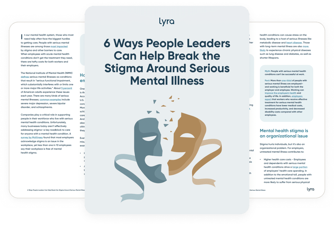 Stigma hurts individuals, but it’s also an organizational problem. For employers, untreated mental illness contributes to higher health care costs, lost productivity, disability claims, and higher employee turnover. As a people leader, you can use this guide as a launching point to build a workplace where employees feel comfortable and safe getting the treatment they need.