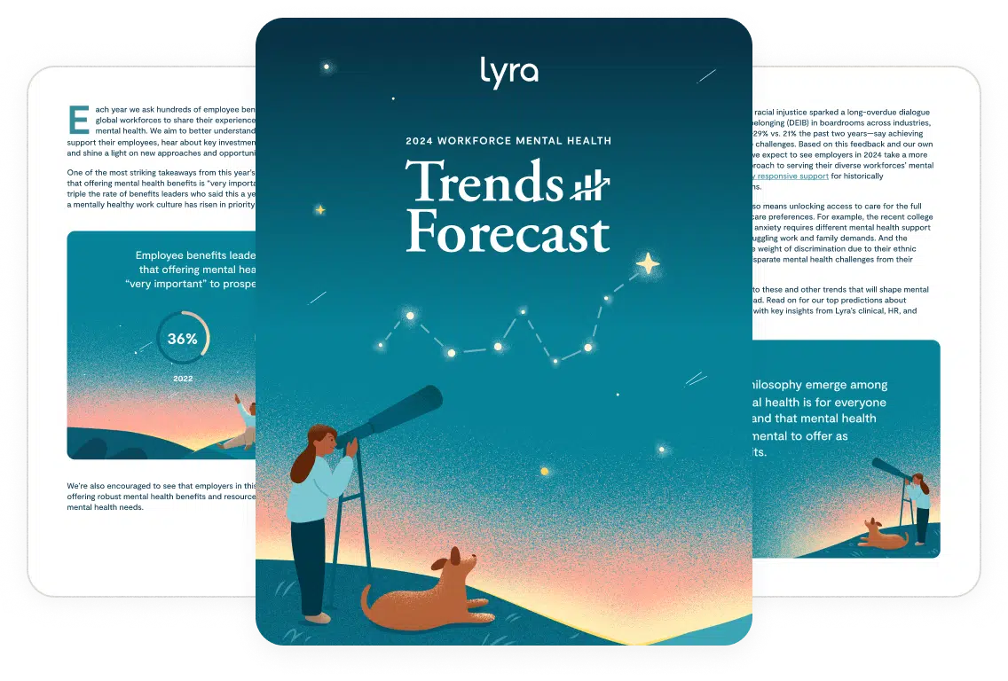 Lyra Health surveyed 250 benefits leaders across the U.S. to identify trends in mental health benefits for 2024. The most striking takeaway from this year’s survey? 94% of respondents say offering mental health benefits is “very important” to prospective employees—nearly triple the rate of benefits leaders who said this a year earlier (36%). Read the report to uncover our top 6 predictions for workforce mental health in 2024, including: