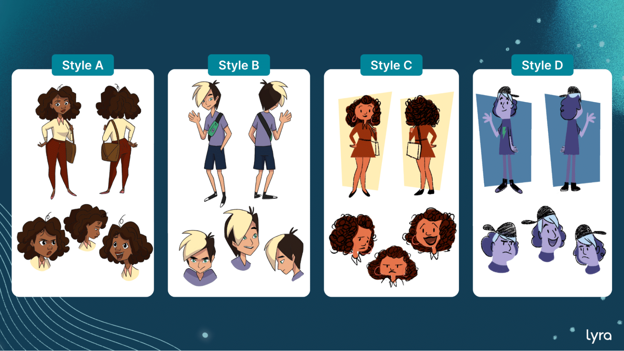 A behind-the-scenes look at Lyra’s content development process. Shown here are different characters evaluated for our teen-specific guided practice sessions.