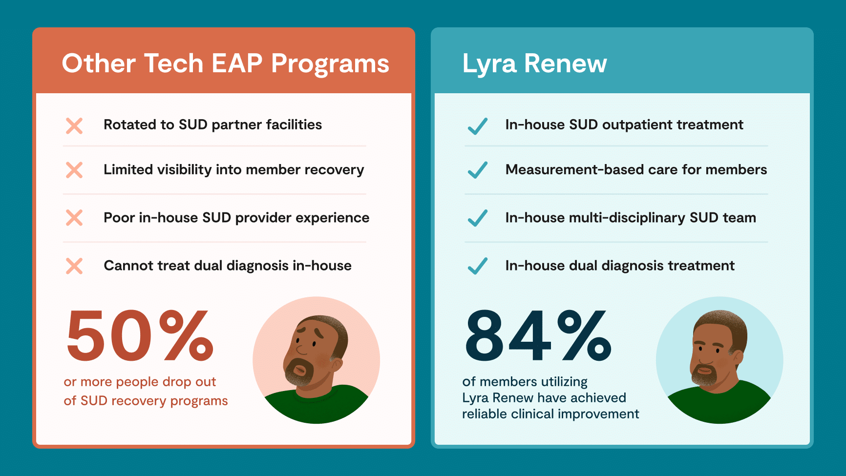 Lyra’s in-house Renew program delivers high-quality and cost-effective care. A recent study found that Lyra delivered a 60% reduction in employer health plan spending for members with substance use disorders.