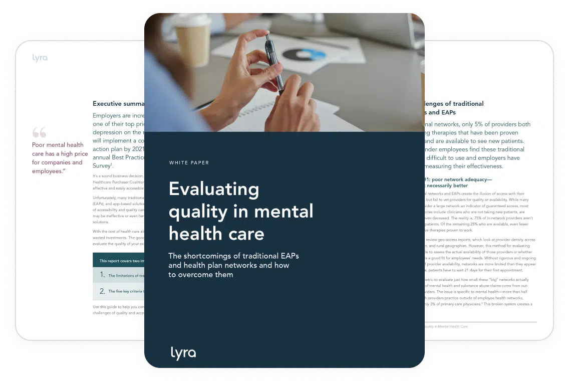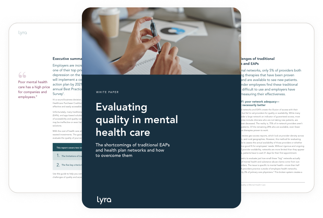 This in-depth white paper provides a framework for understanding and measuring quality in mental health care and how you can ensure your employees are receiving care that helps them improve their health and ability to contribute to your company. With mental health issues and care costs on the rise, identifying effective care models and solutions is a top priority for benefits leaders.