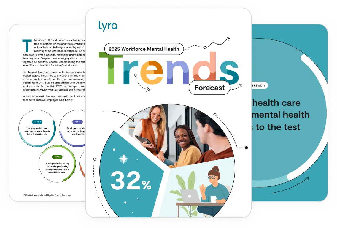 How can benefits leaders balance well-being with tightening budgets? What strategies address today’s most pressing mental health challenges and workplace shifts? Lyra’s 2025 Workforce Mental Health Trends Forecast explores these challenges. Backed by insights from clinical and organizational well-being experts and a survey of 500+ HR leaders, we uncover the key trends shaping workforce mental health to help you plan with confidence and clarity. Read the report to see our top 5 predictions for workforce mental health in 2025, including: