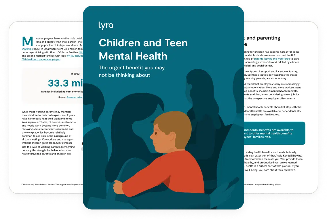 In a Lyra survey of workers across the U.S., 55% of employees said they had a child in their care struggling with mental health issues. One in three of those workers said their own mental health had declined over the past year. With the mental health of parents and their children so connected, benefits shouldn’t stop with the employee. Just as medical, vision, and dental benefits are available to dependents, it’s important to offer mental health benefits to employees’ families, too.