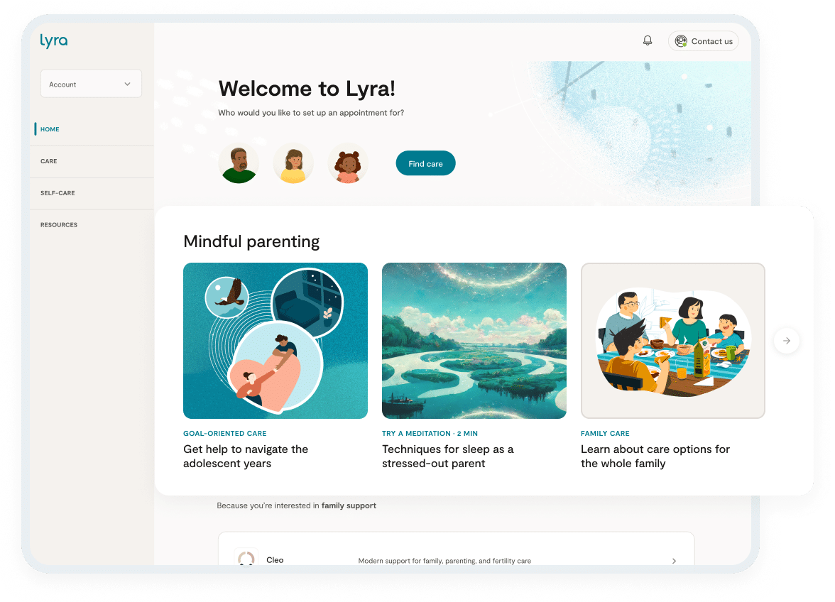 Not enough employees are getting the care they need. Average wait for a mental health visit is 21 days—for a child it’s 7.5 weeks. With Lyra, members can sign up and begin their journey to feeling better in just a few clicks.